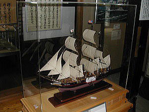 ![]() ▲完成した帆船模型ロアノーク号 岡崎英幸制作 2005(平成17)年5月小栗まつりで除幕披露(東善寺蔵) ▲ The completed sailing ship model Roanoke unveiled at the Oguri Festival in May 2005. |