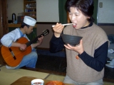 | 群馬から来た、と聞いた主人がギターを弾いてくれる。せっかくの「アランフェス協奏曲」をはたして聴いているのか、ひたすらほおばる。 |
