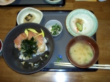 まず腹ごしらえ、と駅近くの「利久」に入る。刺身定食は柔らかな舌ざわりの絶品。少し手をつけてからあわてて撮影。 |