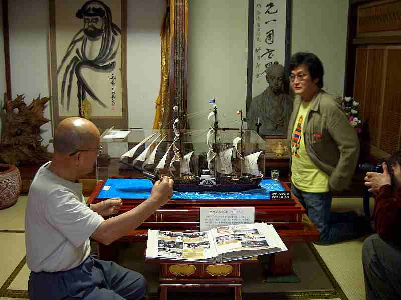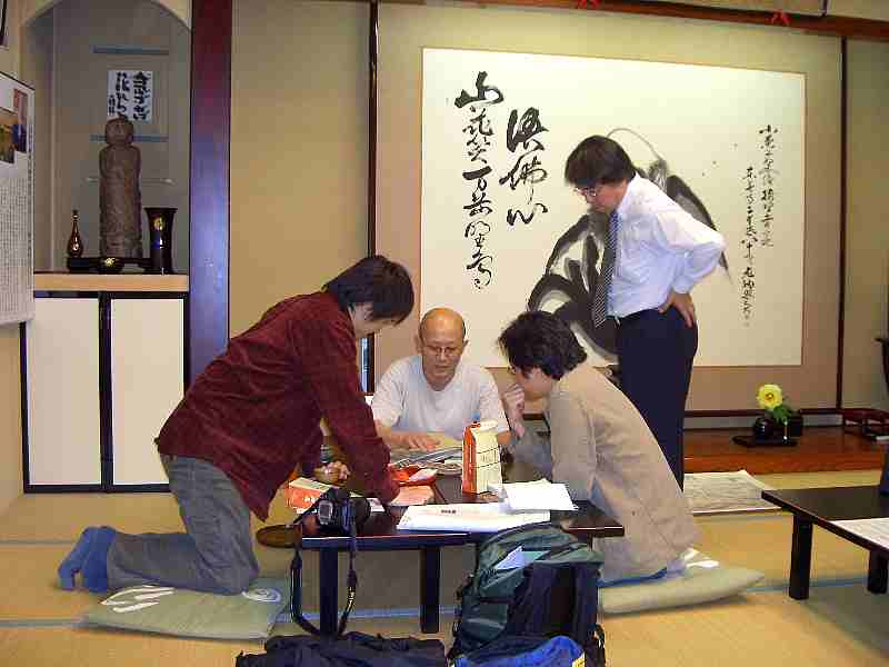 | 作者の取材風景 小栗まつりの翌日、東善寺でくわしく取材して構想を練ってゆかれました。 (平成17年5月22日) |