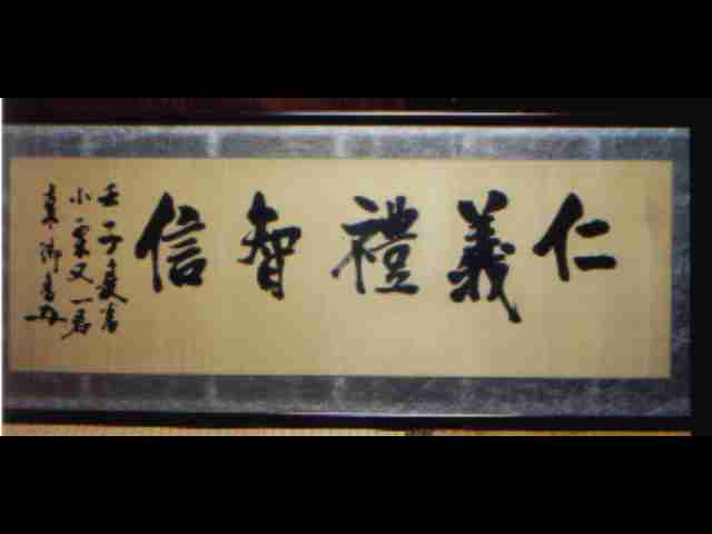 東郷元帥の書額 右から「仁義禮智信 壬子夏為小栗又一君 東郷書」 東善寺蔵 General Togo's calligraphy From right to left: "Jin, Gi, Rei, Chi, Shin (benevolence, justice, gratitude, cleverness, faith), 1912 summer, for Mataichi Oguri, Togo's calligraphy", owned by Tozenji Temple. |