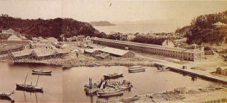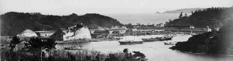| 横須賀製鉄所(造船所) 四つの特徴 Four Features of Yokosuka Ironworks (Shipyard) ![]() ▲写真:1868慶應4年7月(9月から明治元年) 1865慶応元年着工の横須賀製鉄所(造船所)は慶應4年7月にはすべての工場がほぼ完成(1号ドックは工事中)し、蒸気機関が稼働してモノづくりをしていた。 |