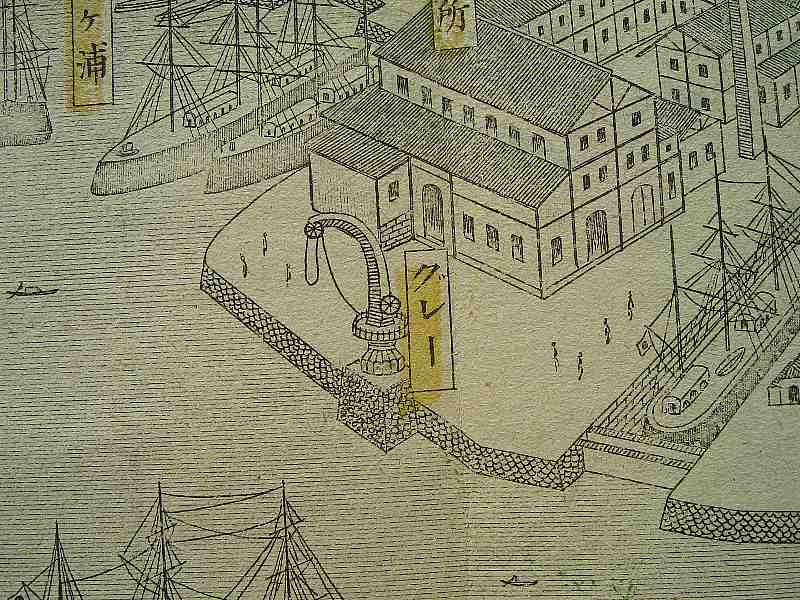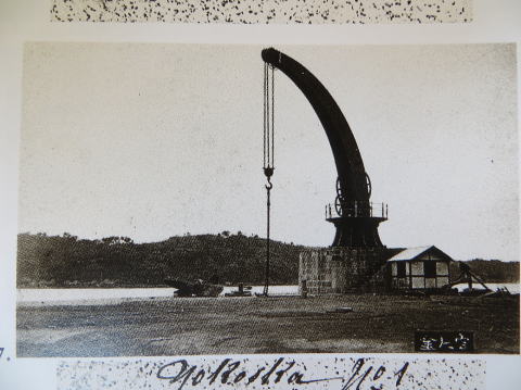 | ▲横須賀製鉄所のクレーン ハンドル二つ、一つは荷の昇降、一つは左右への転回を操作した手動式と思われる。オランダまたはフランス製であろう。 昭和30年代に大蔵省から横須賀市にこのクレーンを払い下げの話があったが、市は断ったという。残っていれば、スチームハンマーと共に日本の大事な産業遺産になっていたろうに…実に惜しい!! 写真:明治初期の駐日イタリア公使バルボラーニ秘蔵の『大日本全国名所一覧』(安池尋幸氏寄贈)より |