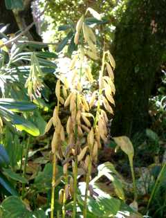 ミズギボウシの実 夏に紫の花をつけました。花の前のつぼみの姿が、宝珠に似ているので「擬宝珠」。コバギボウシ、オオバギボウシなど種類が多い。 |