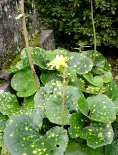 ツワブキ 珍しく、寒くなってから咲く花です。慈母観音の足元で、黄色い花が冬の前の庭を彩ってくれます。これは葉が斑入りです。 |