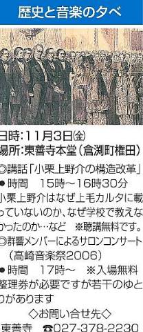 小栗上野介の講話と高崎音楽祭のサロンコンサート「びっくりコンサート」を東善寺本堂で行いました。 2006平成18年11月3日(文化の日) 午後 |