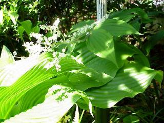きれいな船形の緑の葉の上に白い花をつけるユキザサ。山国ではアスパラのようにおひたしにして食べる。 これは榛名山に特有な大型種で葉も茎も大きく、葉の数も多い。 |