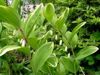 二つの花がぶつかり鳴子のようだから、ナルコユリ。斑入りの葉にご注目あれ。 |