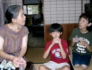 吉岡夫人と豊原ファミリー 初めて訪ねた私たちを温かく迎えてくれた吉岡乳店の 洋子夫人。3月には東善寺へおいでになった。 |