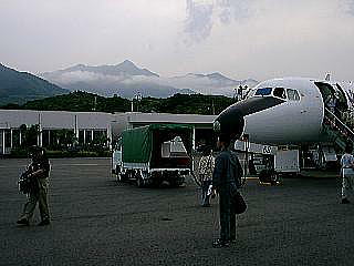 | ▲屋久島空港 15時55分着愛子岳らしい山が雲の上に見えて、南の島の雰囲気。 | ▲田代別館 大きい旅館で「もののけ姫」の取材で宮崎駿監督がしばらく滞在して白谷雲水峡などに通ったという。 |