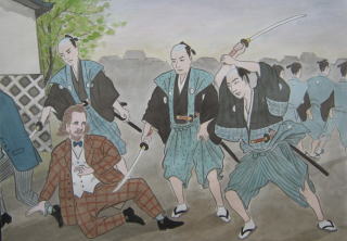 | ふつう、天皇を敬うという意味だが、本来は仁徳による統治「王道」を説く老子の理念に基づくもので、中国の伝説にその考えがあらわれている。 伝説の皇帝「尭ぎょう」は理想の政治「鼓腹撃壤こふくげきじょう…国民がたっぷり食べられ、腹つづみで地を撃って踊り楽しむ」理想の政治を行なった。そして尭は皇帝の地位を息子ではなく、有徳の士「舜しゅん」に譲った。舜もまた同様に理想の政治を行い、皇帝の座を有徳の士「禹う」に譲った(禅譲ぜんじょうという)。 あくまでも伝説の話だが、その伝説を日本では誰か、と実在の醍醐天皇(延喜えんぎ・901ごろ)と村上天皇(天暦てんりゃく・948ごろ)が摂政・関白なしで直接政治を行なった(天皇親政という)から中国の理想の皇帝「尭・舜・禹」と同じだ、「延喜・天暦の時代が理想だ」とあてはめて解釈し、「天皇親政」の邪魔になるのが幕府政治、と排する倒幕運動につなげた。 ただし、 ◆天皇が禅譲ではなく、世襲でその子に地位を譲っている点は目をつぶって無視している。 ◆醍醐・村上天皇はたまたま部下に摂政・関白になる人物がいなかっただけで、「目立つほどの良政をした」という学説はない。 明治政府は「天皇親政」をめざし、天皇を現御神(あきつみかみ・神樣である人)とし、昭和20年(1945)12月末日まで国民統治の絶対権力者とした。 ![]() ▲生麦事件 攘夷運動につながって起きた事件 |